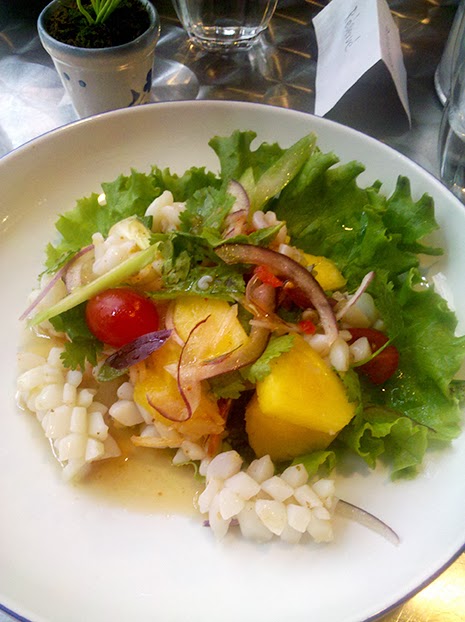 La fraîcheur de cette salade, l'acidité de la sauce au fond de l'assiette, la chaleur et la présentation des encornets bien cuits, l'ananas sauté ou mariné (dans je ne sais quoi), le dosage équilibré des herbes et des multiples saveurs ont fait que j'ai adoré ce plat.